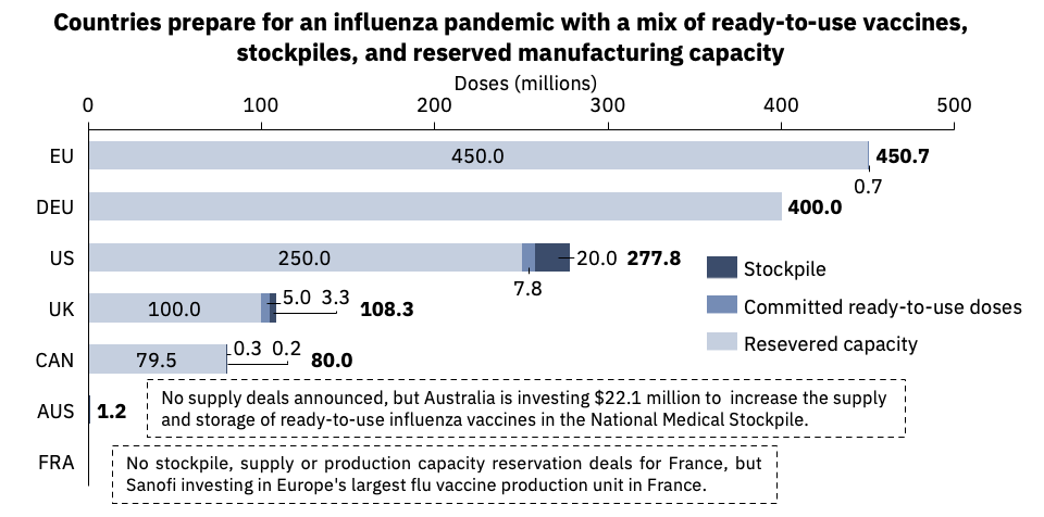 The analysis includes a mix of stockpiled or secured pre-pandemic vaccines which are ready to be used and reserved manufacturing capacity. Pre-pandemic vaccines have been created against known circulating strains of the H5N1 virus. In the event of an actual pandemic, vaccines which matched the circulating pandemic strain would be developed and deployed as quickly as possible. However, over 80% of flu vaccines rely on slow, hard-to-scale egg methods which will limit rapid response, especially for countries without local manufacturing.